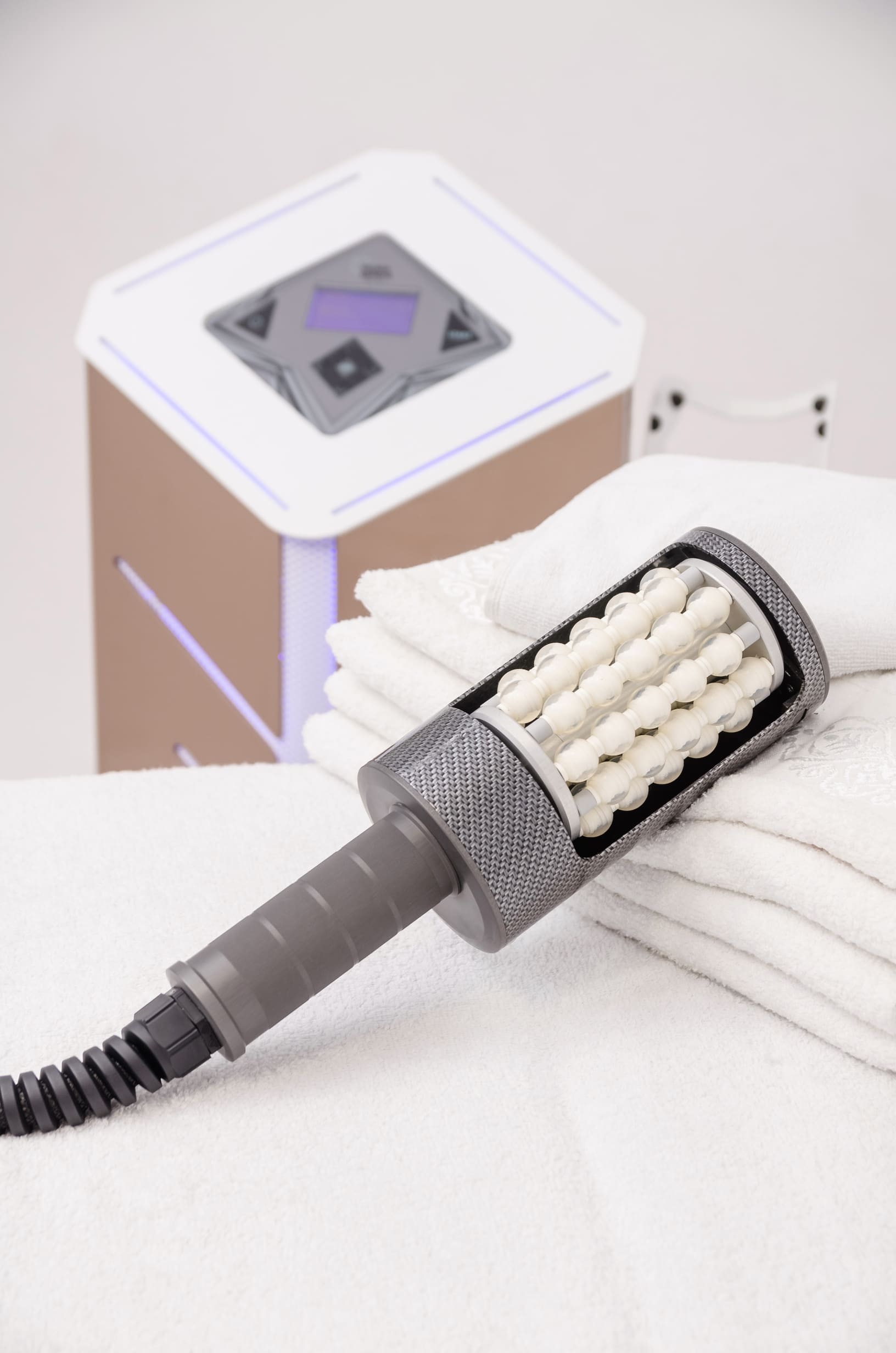 - Faza 2: Intensywny masaż: Zwiększenie intensywności mikrowibracji w celu rozbicia złogów tłuszczowych, poprawy tekstury skóry i redukcji napięcia mięśniowego.